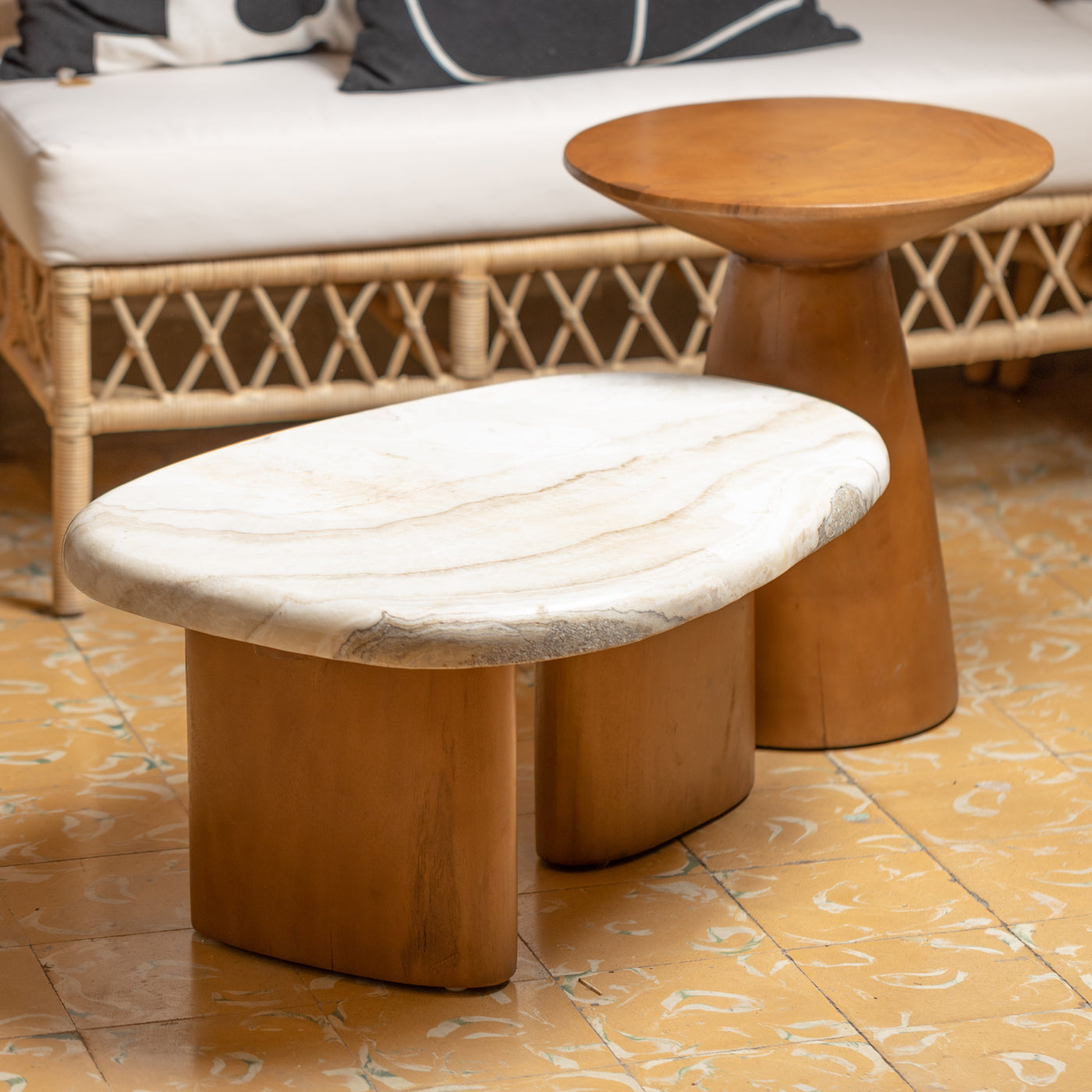 Descripción: La mesa mitra es una pieza que todos deberíamos tener en casa! El sobre de la mesa hecho de mármol le da un toque elegante y sofisticado, luego suavizando con su segunda pieza hecha de madera teca.