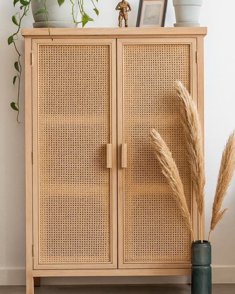 Descripción: A este armario puedes darle múltiples usos, algunas ideas son tipo bar, guardar vajillas, sábanas, es de madera teca y ratán artesanal hecho en Bali.